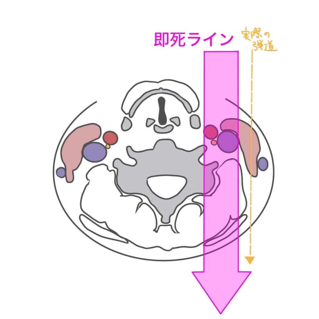 ポイントは、「首のど真ん中」ではなく、「やや外側」を撃たれているという点です。